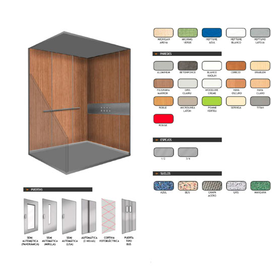 Todas van compuestas de: Jambas, Dintel, Zocalos, 1 Pasamano y Perfiles en Acero Inox, Suelo silestone , Damero o Goma pirelli, Techo blanco con ojos de buey o Plaflon de Led. Espejo. ( medio, entero , 1/3, o varios ). Cabinas personalizadas 100%.